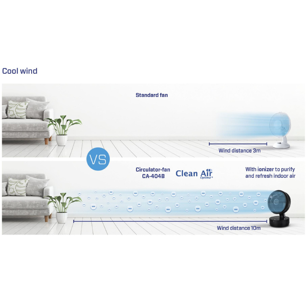 De Clean Air Optima CA-404B is een unieke circulator-ventilator voor koele prestaties tijdens warme dagen. De CA-404B met de unieke Clean Air Optima roterende- wervelende- en spiraalvormige luchtstroomtechnologie, zorgt ervoor dat het gehele luchtvolume in de binnenruimte, snel, koel en continu circuleert en tegelijkertijd effectief geïoniseerd wordt. Het elegante, compacte design van de CA-404B past naadloos in elk stijlvol woon- en/of zakelijk interieur.